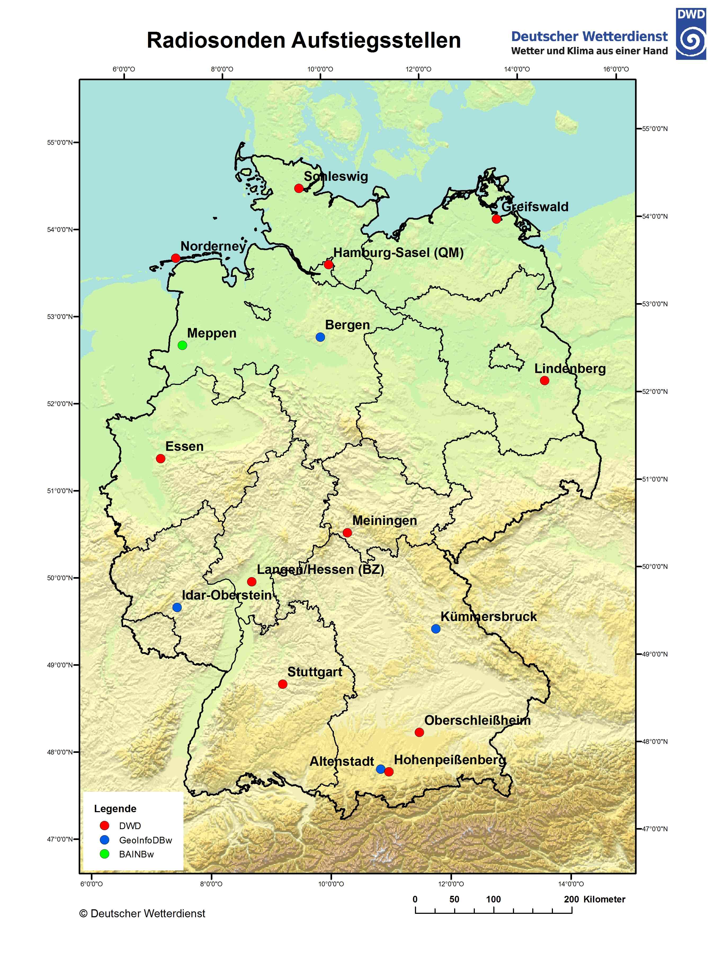 The first step is deciding which radiosonde stations to use for the training data. Currently, only radiosondes from the German weather service can be downloaded. For sites outside of Germany, a download option must first be implemented. Below is a map of radiosonde stations in Germany, along with a table of their station IDs. It is useful to use the stations that are closest to the MWR site. For the example of Munich, the Oberschleißheim station alone was enough as it had data since 1990 and about 20000 usable profiles.